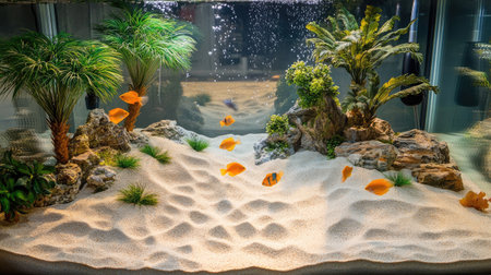 A beautifully designed freshwater aquarium brings a sense of calm and tranquility to any space. The meticulously raked white sand mimics a Japanese zen garden, creating a peaceful underwater landscape where small, vibrant fish swim among rocks and lush green plants. This miniature ecosystem is a perfect representation of balance and natural harmony, offering a quiet escape from the everyday.
