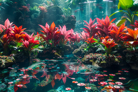 Vibrant Underwater Scene with Red Aquatic Plants and Floating Lilies in a Serene Pond Environment AI Generative