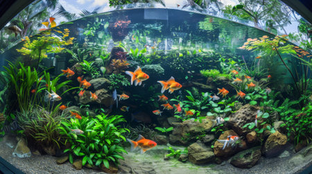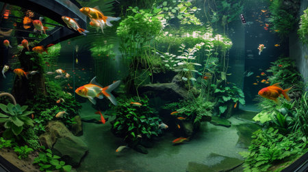 A stunning panoramic view of a meticulously landscaped goldfish tank, featuring lush greenery and vibrant aquatic life in harmony.