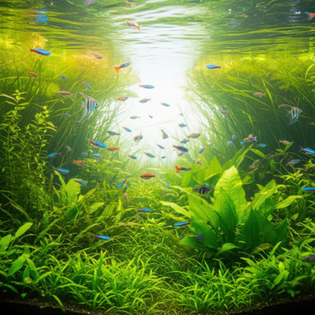 An underwater scene inside an aquarium tank with colorful fish swimming amongst plants, creating a peaceful aquatic environment.