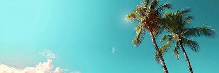 A serene view looking up through a canopy of lush, green palm trees set against a vivid blue sky dotted with a few white clouds. the sunlight filters through the palm fronds, creating a peaceful and tropical atmosphere perfect for summer-themed designs. Generative AI