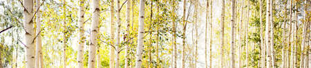 Picturesque scenery of the golden birch forest on a clear sunny day. Early autumn in Latvia, Europe. Pure nature, environmental conservation, eco tourism. Tree trunks, natural leaf texture