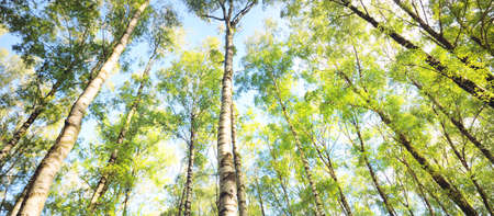 Low angle view of the green birch forest on a clear day. Public park. Tree trunks close-up. Blue sky, sunlight, daylight, sunbeams. Ecology, landscape design, landscaping, textures, backgrounds