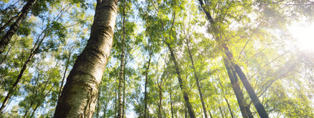 Sunlight through forest foliage in a summer day in mountain. Beautiful natural view of an Italian park with birches. Background pictures with branches and leaves. Nature, pollution, climate concept.