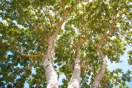 Birch trees with green leaves against the blue sky, bottom view. Birch Grove.
