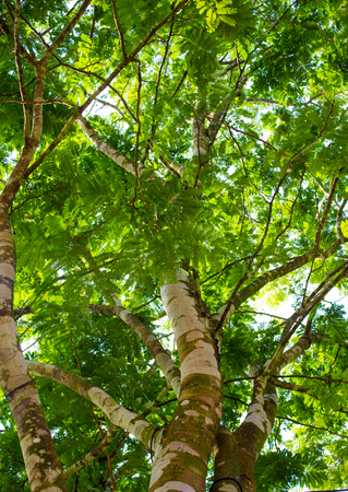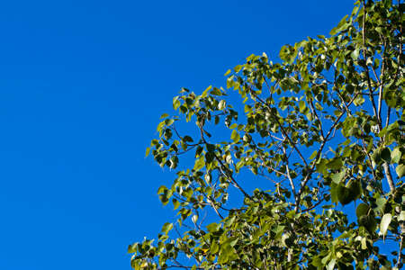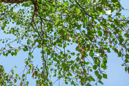 Looking up the birch tree, small green leaves against blue sky background. Abstract spring nature background.