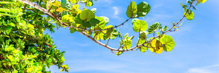 Sacred fig leaves (Ficus religiosa) and blue sky