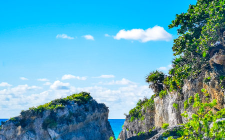 Rock at natural seascape and beach panorama view at the ancient Tulum ruins Mayan site with temple ruins pyramids and artifacts in the tropical natural jungle forest palm in Tulum Mexico.
