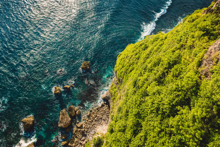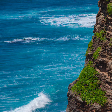 Picturesque seascape: a powerful cliff on the Indian Ocean. Turquoise sea water with white foam meet rough stone rocks on the shore. Powerful and peaceful nature concept. Uluwatu, Bali.
