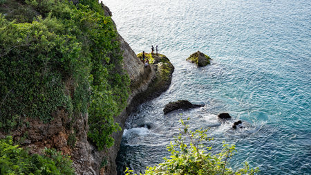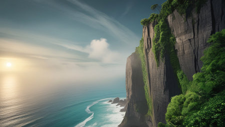 Dramatic rocky cliff overlooking serene turquoise ocean