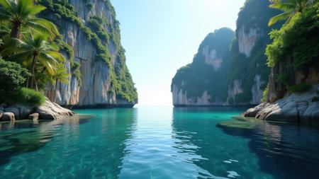 Serene tropical scene showing towering cliffs and lush greenery surrounding tranquil turquoise waters. ideal for travel inspiration, relaxation themes, and exotic getaway promotions.