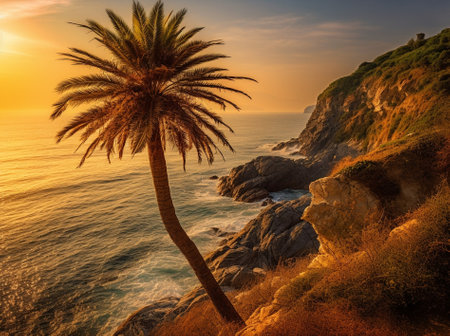 A serene tropical landscape with a palm tree, a clear blue sky, and a beautiful sunset over the ocean.