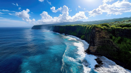 A breathtaking coastal view featuring lush green cliffs, a calm ocean, and a radiant sky. Perfect for evoking serenity and a love for nature in summer settings.