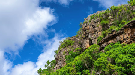 A stunning rock formation rises majestically with vibrant greenery against a bright blue sky filled with fluffy white clouds, showcasing nature's beauty.