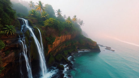 Tropical waterfall in the morning mist. View from above.