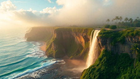 A breathtaking aerial view of a cliff above the ocean with stunning natural landscape, water merging with the sky, and terrestrial plants lining the beach AIG50