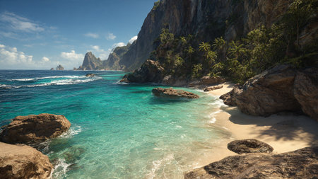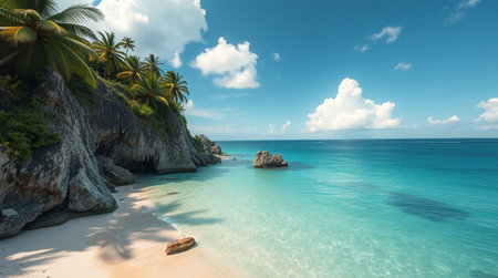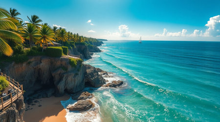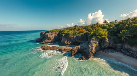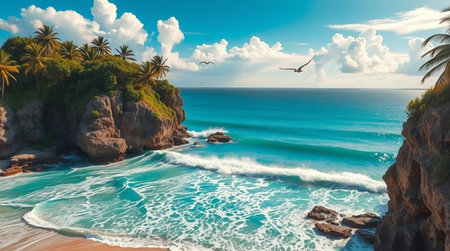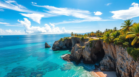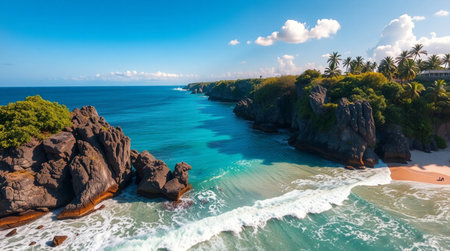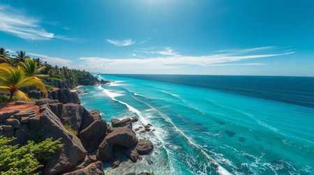A breathtaking view of a rocky coastline featuring palm trees, turquoise waters, and waves gently crashing against the shore, embodying the tranquility of nature's beauty.