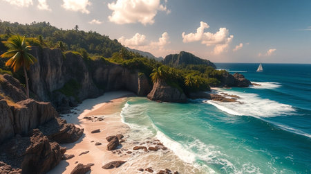 Aerial view of beautiful tropical beach with palm trees and sailboat