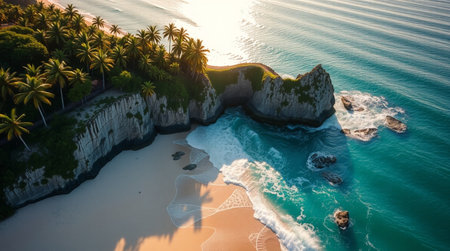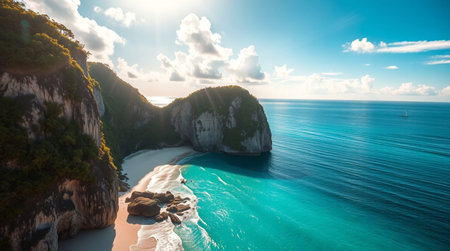 Aerial view of beautiful tropical beach with turquoise water and cliff
