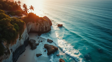 Aerial view of the coastline at sunset, Bali island, Indonesia