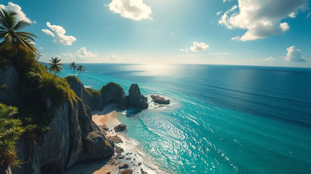 Aerial view of beautiful tropical beach with coconut palm trees. Seascape with turquoise ocean and rocks. Drone photography.