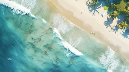 Generative AI : Beautiful white sandy beach with turquoise ocean water waves and green fluffy palm trees Aerial top view copy space