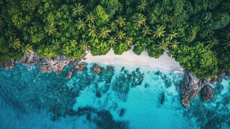 Discover a captivating aerial view of a tropical beach surrounded by lush palm trees and crystal-clear waters, perfect for relaxation and adventure.