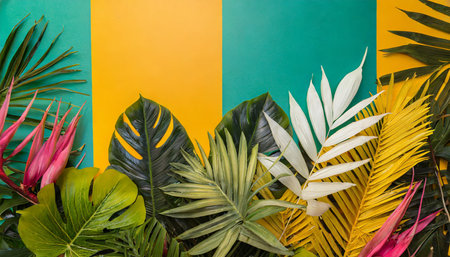 Tropical background. Palm and monstera leaves on yellow blue background. Flatlay, top view, minimal layout, summer concept banner