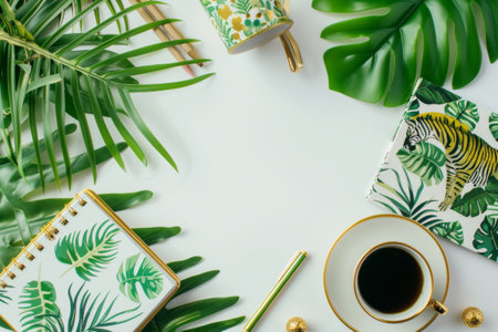 Office accessories with tropical print. Greenery in the background. Generative AI illustration