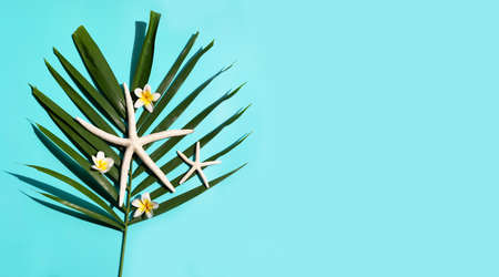 Starfish with plumeria or frangipani flower on tropical palm leaves on yellow background. Enjoy summer holiday concept. Copy space