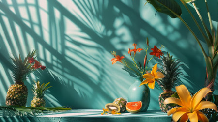 A tropical floral arrangement with lilies, pineapples, and leaves, casting shadows on a teal background, evoking a warm, exotic ambiance.