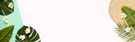 Tropical top view summer botanical concept still life white frame with monstera liana, vine, palm leaves and plumeria frangipani flower flat lay layout