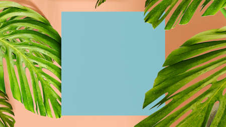 Tropical leaves Monstera with gray square for your text on pink background. 3d rendering