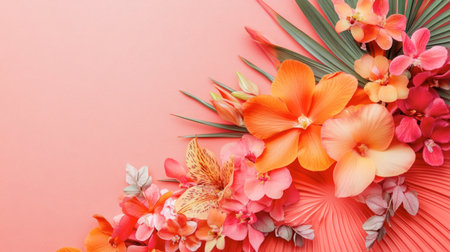 A stunning floral arrangement featuring vibrant tropical flowers set against a soft coral background, showcasing colorful petals and intricate details for design and decoration.