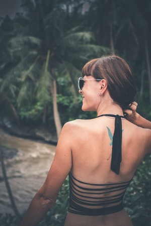Close-up portrait of a young beautiful girl in glasses with reflection of tropical palms. Summer rest. Modern tourist