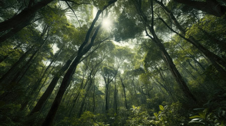 A low-angle view looking up through a dense, vibrant green rainforest canopy with sunlight filtering through the...