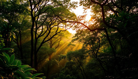 A captivating scene of a tropical rainforest featuring tall trees and vibrant green foliage. Sunlight filters through, casting a serene atmosphere in this natural sanctuary.