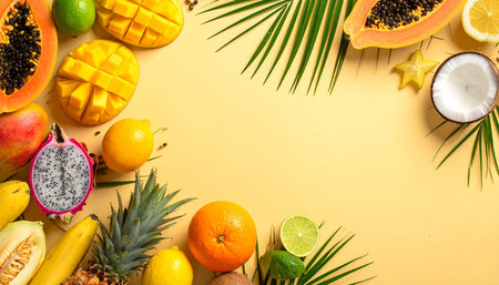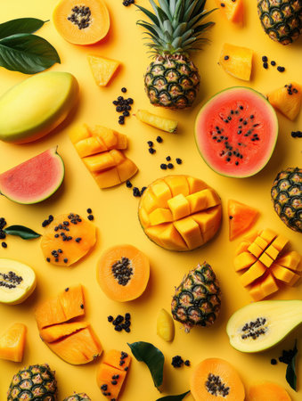 Colorful tropical fruits like mangoes, pineapples, and papayas are beautifully sliced and displayed against a vivid yellow backdrop.