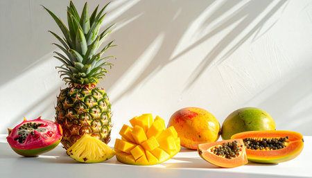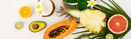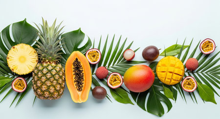 Keywords: showing assortment of fresh tropical fruits and green leaves arranged on a white background with copy space keywords: pineapple, mango,...