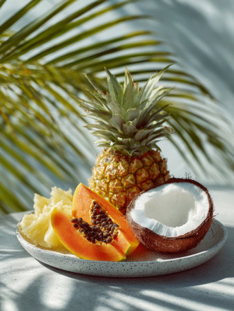 Sliced papaya, pineapple, coconut and peeled pineapple pieces are arranged on a plate, bathed in sunlight filtering through palm leaves, evoking a tropical summer atmosphere