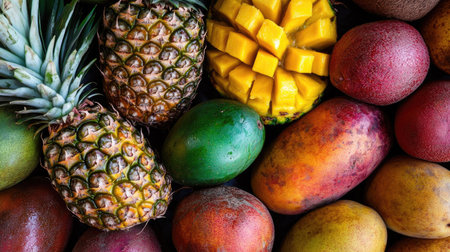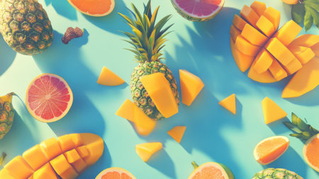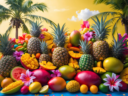 Brightly colored tropical fruits are artistically sliced and arranged, featuring pineapples, mangoes, and papayas on a vivid backdrop.