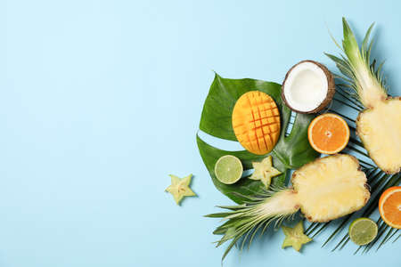 Tropical fruits background with copyspace. Ripe exotic fruits including sliced pineapple, grapefruit, mango and pomegranate on color background with text space.