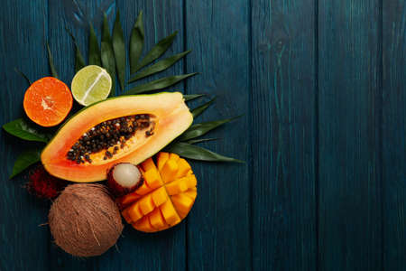 fresh tropical fruits - rambutan, papaya, kiwi, mango on a wooden background