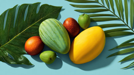 A vibrant arrangement of fresh fruits including mango, papaya, and green apples set against a blue background with tropical leaves, ideal for food-related projects.