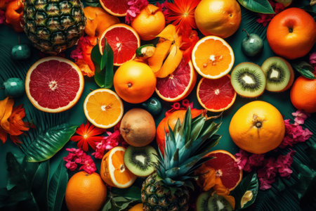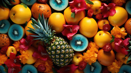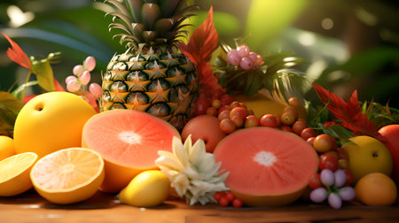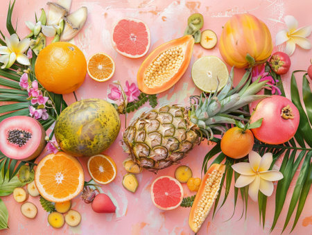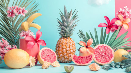 Vibrant display of tropical fruits and flowers, including pineapple, grapefruit, and hibiscus flowers, on a bright pastel background evoking a summery vibe.