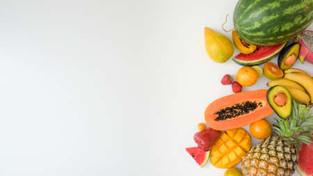 Overhead shot of assortment of exotic fruits, summer fruits, tropical fruits and copy space on white background