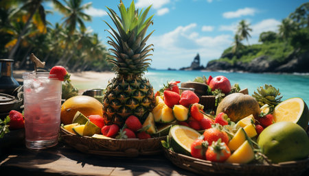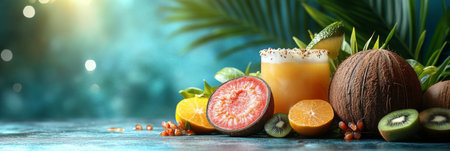 AI Generated. Healthy Summer Fruit Juice with Exotic Fruits in a Lush Tropical Setting