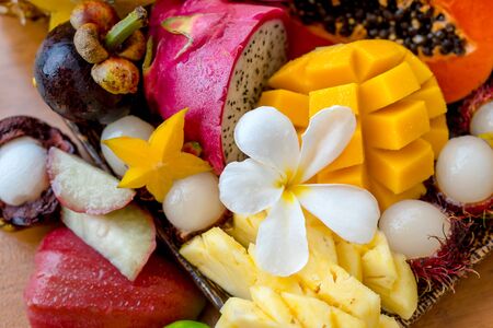 Juicy ripe tropical Thai fruits on a wooden dish.