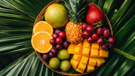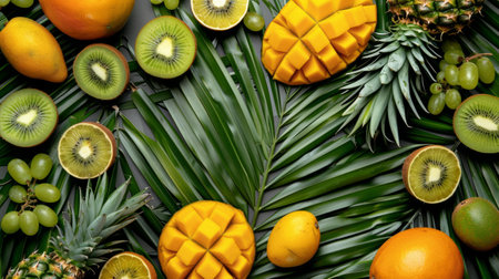 Colorful arrangement of exotic fruits and lush palm leaves resting on a vibrant green backdrop, offering a refreshing tropical vibe