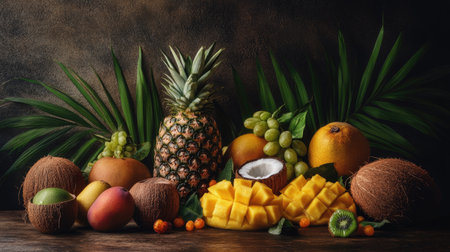 A variety of tropical fruits, including pineapple, mango, and coconut, arranged in a colorful display.